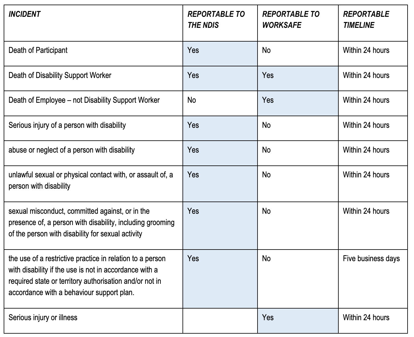 - Mandatory reporting to the NDIS Quality and Safeguards Commission if required